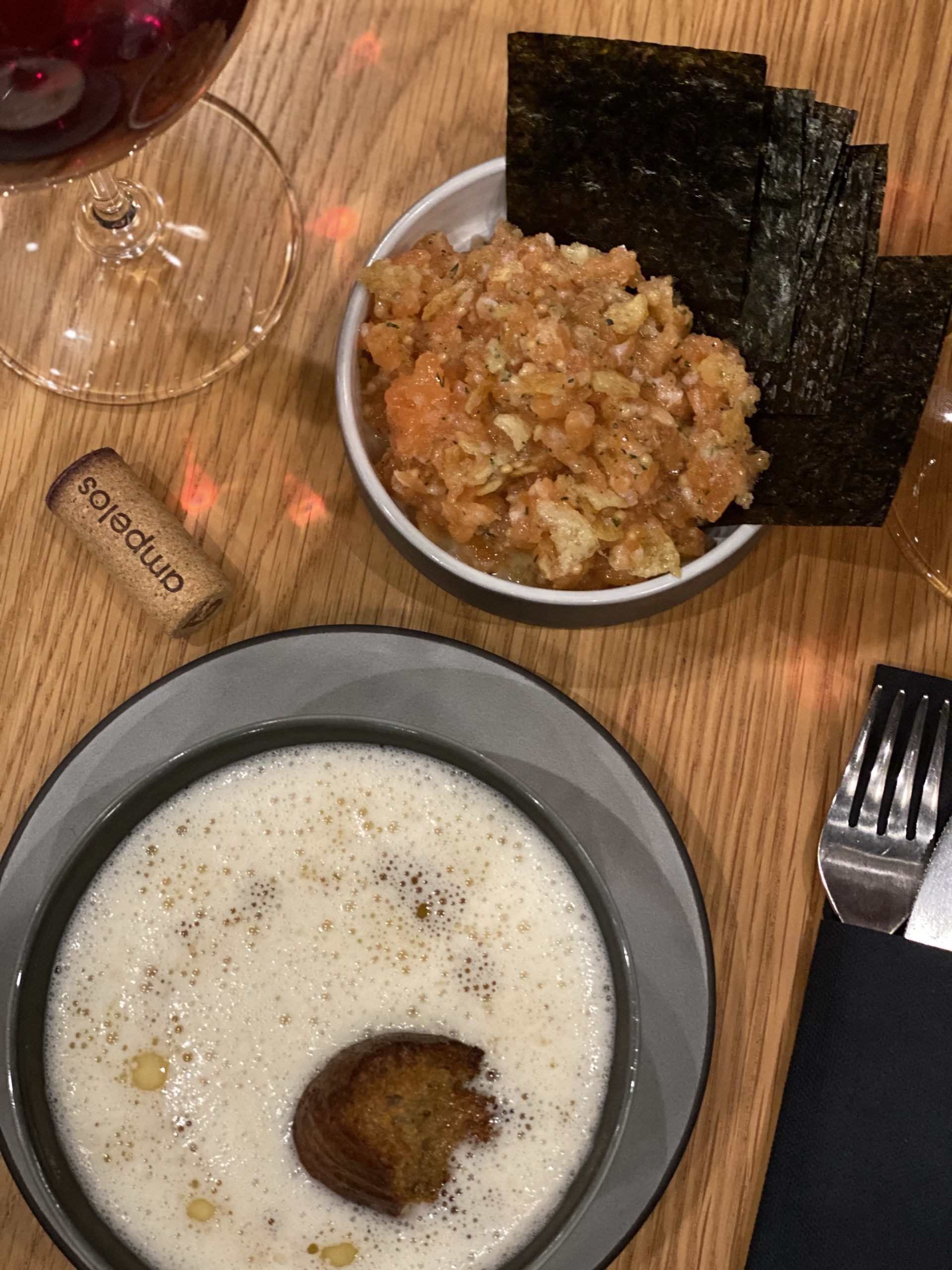 For starters we picked the salmon tartare with potato chips and nori & the sunchoke velouté with halibut and croutons. Both So good!